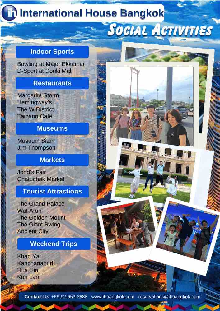 Freizeitprogramm: Unsere Sprachschule in Bangkok bietet Schultouren und Aktivitäten an. Sie organisieren viermal pro Woche Schulaktivitäten, und zwar mittwochs, donnerstags, freitags und samstags. Diese Aktivitäten beziehen sich auf die thailändische Kultur und interessante Orte, an denen unsere Mitarbeiter und die Schüler gemeinsam schöne Momente erleben können. Alle Sprachschüler können an den Aktivitäten teilnehmen. Die Schüler müssen lediglich für Transport, Mahlzeiten und eventuelle Eintrittsgelder aufkommen.